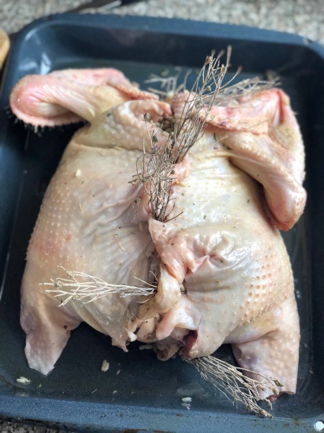 I seasoned the inside of the bird with some salt and pepper, parsley, nutmeg, and a few thin slices of butter along the breast meat. I keep a little supply kit of some herbs and ingredients I like around too, including some sprigs of amazing wild mountain oregano and thyme from Greece. A dear friend brought me back bunches from her recent trip. Oh yes, that’s right, I also sprinkled those on the bird!