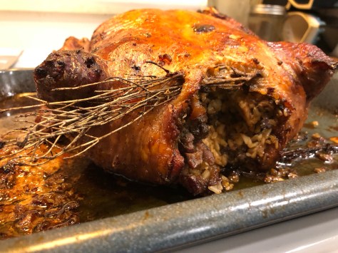 Once the rice was al dente, done but able to handle more cooking, I took it off the heat and let it cool a bit. I then piled in as much as possible into the center of the bird, shoved some in the leg pockets, then stretched and pulled; overlapping the skin alternately like a shoe lace. As it turned out, the oregano has a very sturdy stalk which worked perfect as a skewer to secure my franken turkey’s backside together.
